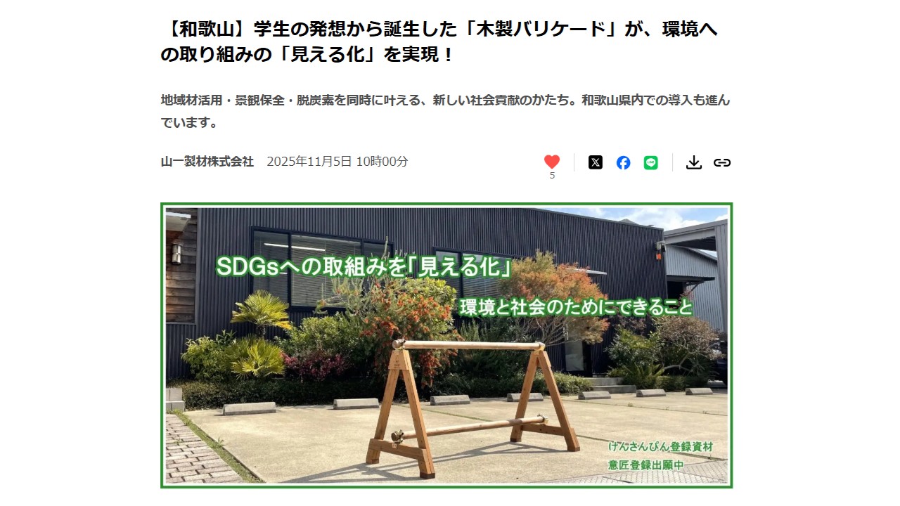 【プレスリリース】【和歌山】学生の発想から誕生した「木製バリケード」が、環境への取り組みの「見える化」を実現!