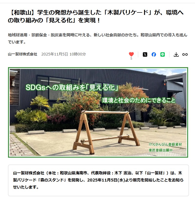 【プレスリリース】【和歌山】学生の発想から誕生した「木製バリケード」が、環境への取り組みの「見える化」を実現!